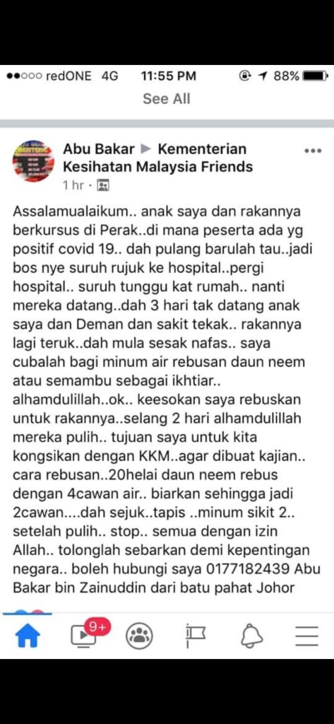 Baru-baru ini ada juga Acik dengar berita mengenai seorang penuntut sebuah maktab di Perak yang sembuh dari sakitnya selepas mengambil air daun semambu. Cuma Acik tak pasti betulkah sakitnya itu disebabkan oleh jangkitan Covid19 atau sakit jenis lain.